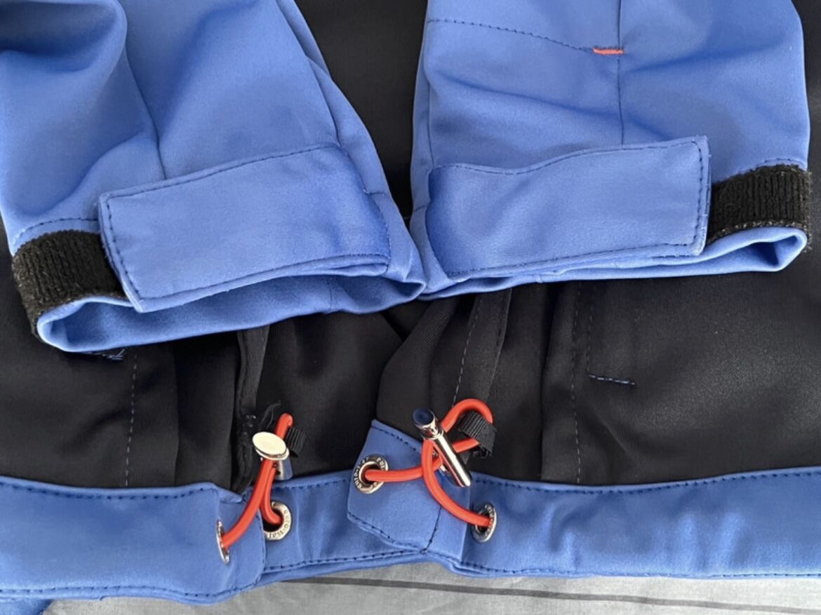 kaum getragen, mit Stehkragen, ohne Kapuze, zwei seitliche Taschen mit RV, eine Brusttasche außen mit RV, eine kleine RV-Tasche am linken Unterarm, 4fach Belüftung unter dem Arm, Ärmelabschluss mit Klett verstellbar, Weite 2fach verstellbar; Farbe ist nicht Royalblau, am ehesten treffen es Bild 4 und 7