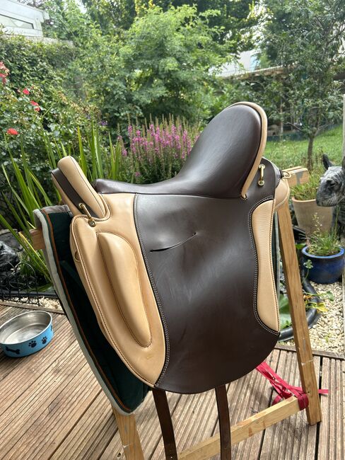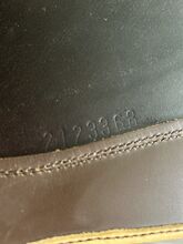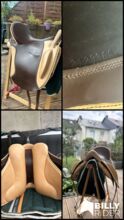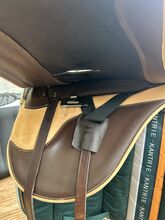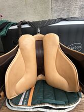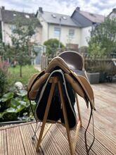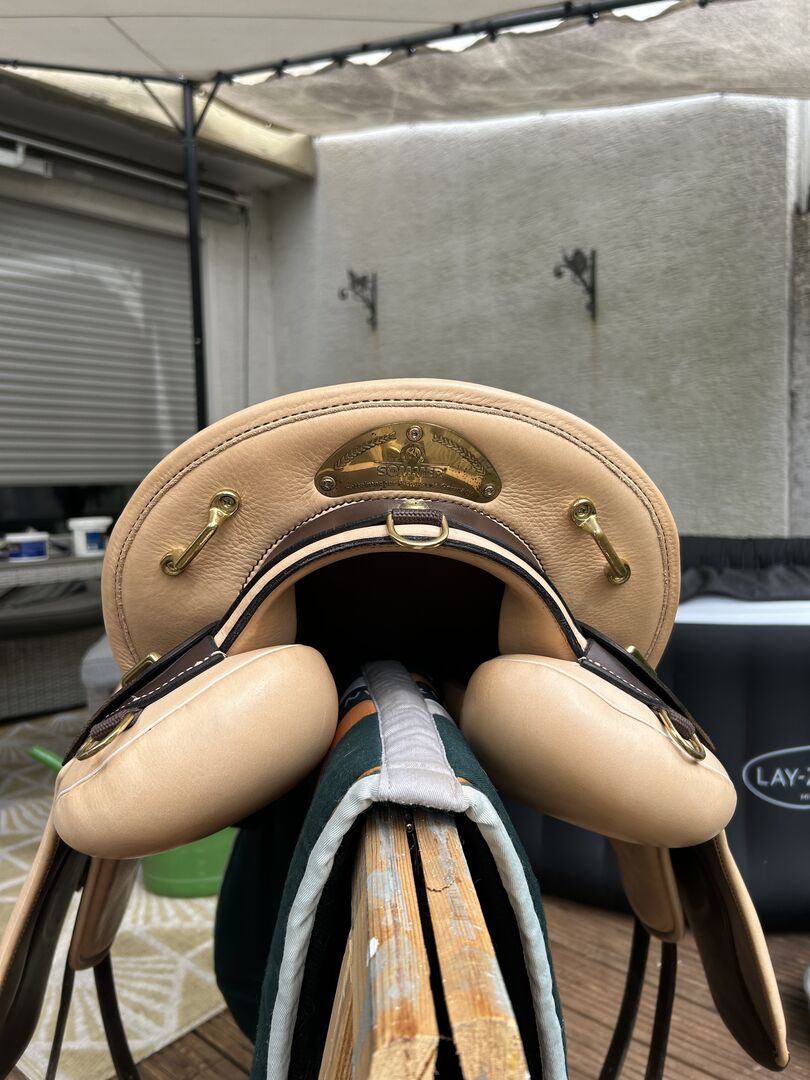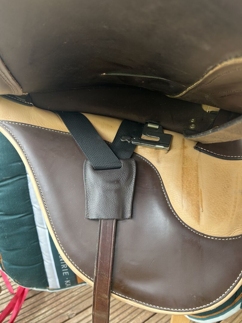 Wanderreitsattel hat ein Dressurblatt und ist somit sehr vielfältig. Er kann auch mit normalen Dressurschabracken benutzt werden. Es ist eine Sonderausführung, sowohl die Farbe Mocca/Natur, als auch einige Zusätze. Auf den Fotos sind sie gut zu sehen. Im Sattelblatt sind Schlitze für die Steigbügelriemen, diese sind normalerweise nicht vorhanden, man kann also wählen ob man die Riemen lieber auf oder unter dem Sattelblatt möchte. Zusätzlich ist unter dem Sattelblatt eine kleine Schlaufe befestigt worden. Dort kann die vordere Gurtstrupfe fixiert werden, muss sie aber nicht. Das verhindert bei sehr bauchigen Pferden, das der Sattelgurt nach vorne rutscht. Durch die Befestigung bleibt er in der Gurtlage liegen. Der Sattel hat eine Sitzgröße von 17“, mehrere Ringe zur Befestigung von Packtaschen und aufgesetzte Pauschen. Verbaut ist ein voll flexibler Kunststoffbaum und ein Kopfeisen, welches sich jederzeit kalt anpassen lässt. Der Sattel hat große weiche Kissen und viel Wirbelsäulenfreiheit.