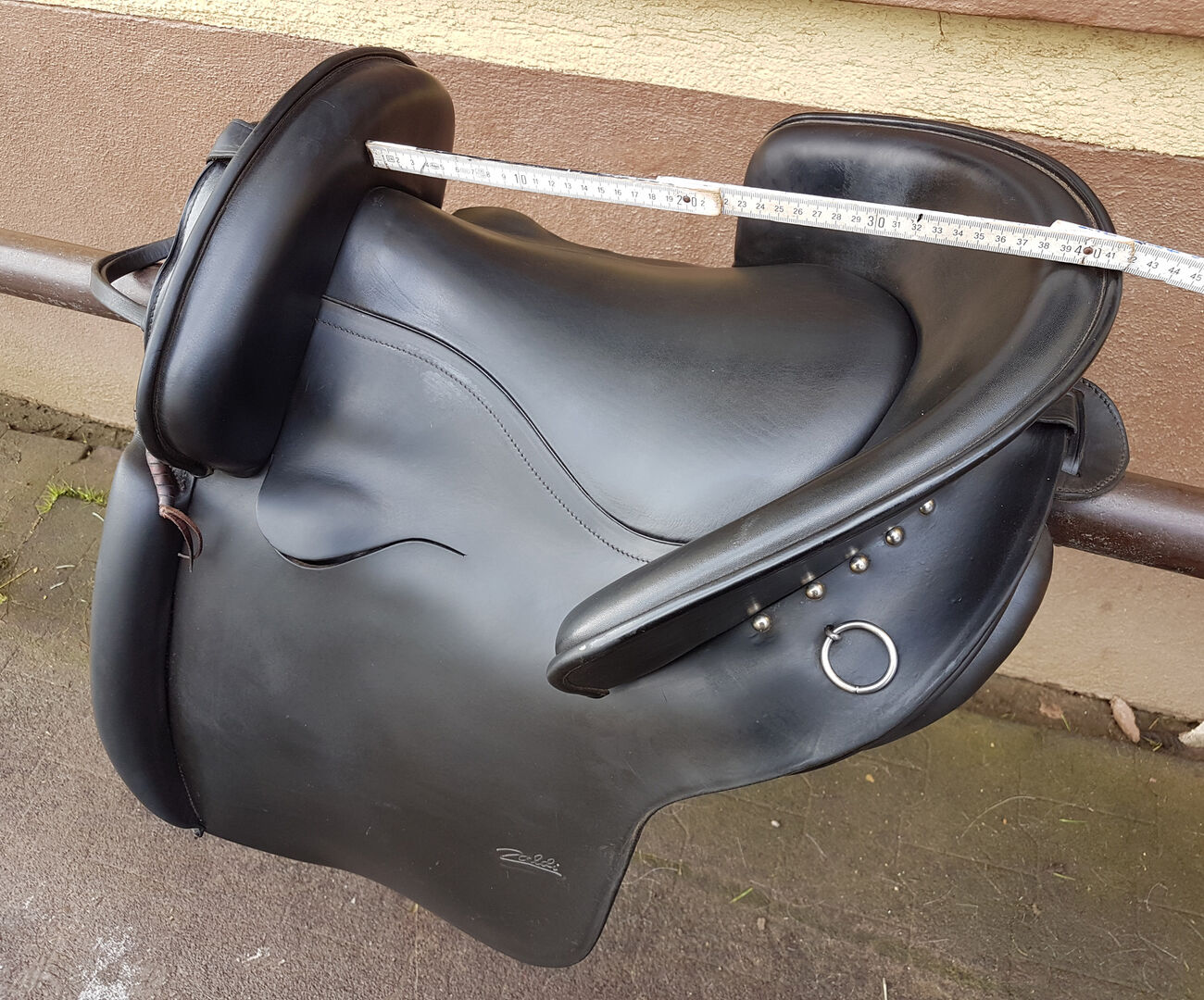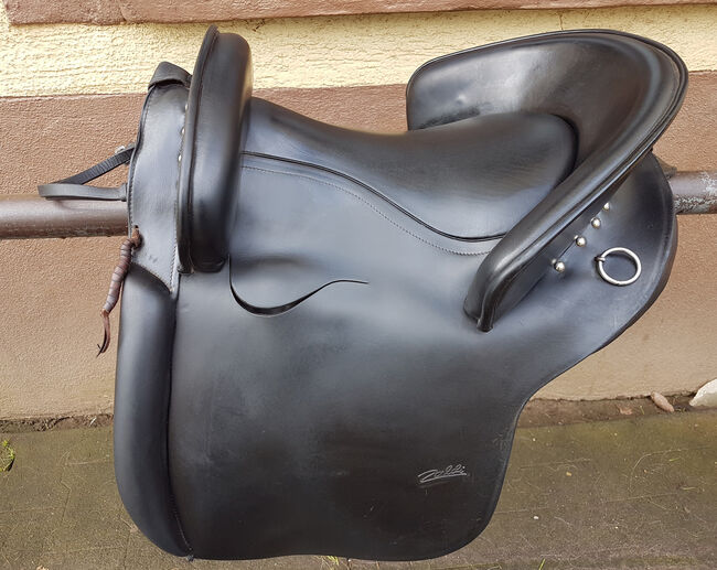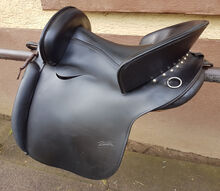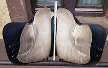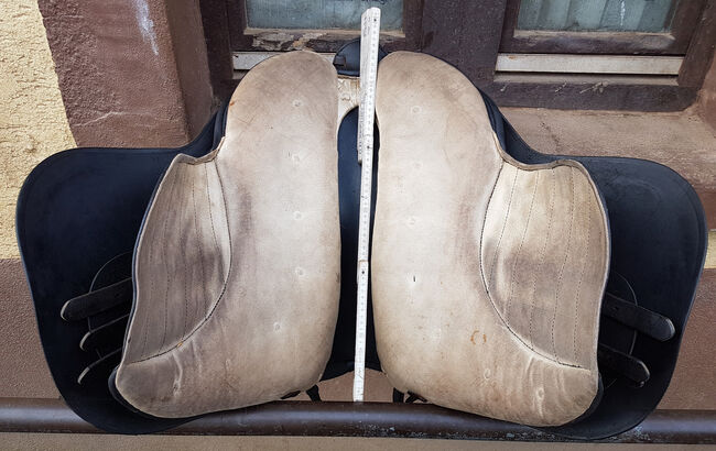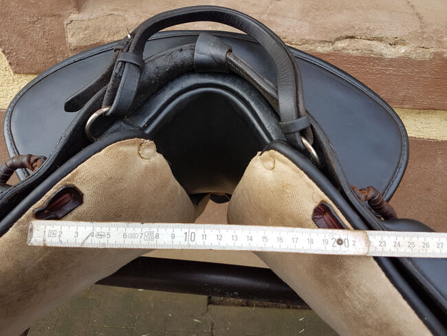 Modell Mixta, Seriennummer 005040 mit großer 15,5 Zoll Sitzfläche (im Westernmaß, entspricht Damenhosengröße 38-42), ca. 39cm Platz zwischen den Galerien. Farbe ist schwarz. Breite Kammerweite. Gesamtlänge ca. 48cm, Auflagefläche ca. 45cm. Sattelblattlänge ab Sturzfeder ca. 32cm. Lag auf rundlicher 144cm Camarguestute.