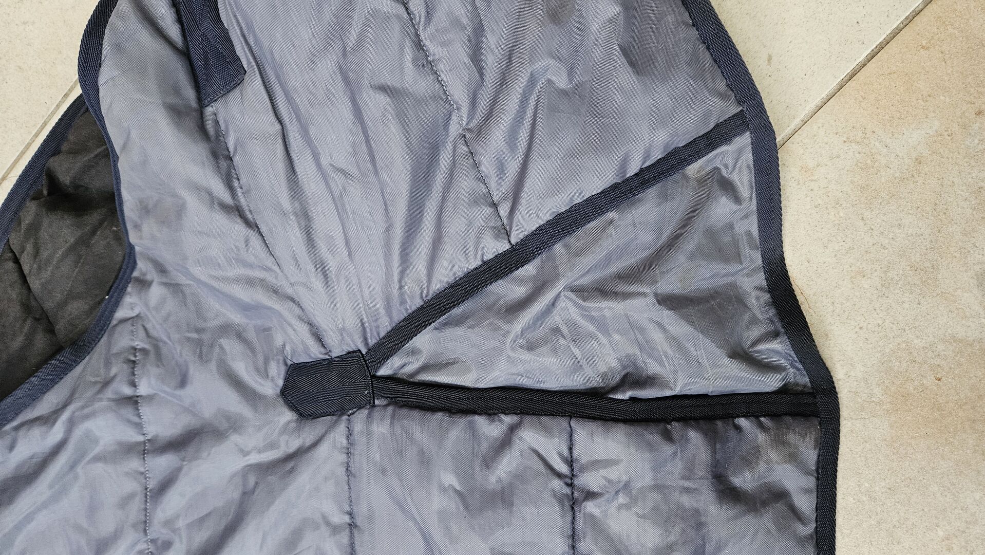 Gebrauchte Stalldecke , nicht wasserdicht, 145cm Baumwollfutter mit geschätzt 150g Füllung.Nicht mehr. Kreuzbegurtung, Schweiflatz mit Schweifriemen Doppelte verstellbare Frontverschnallung Gehfalte, Widerristpolster. sehr schönes grau, leicht glänzend. ( kommt auf den Bildern nicht so gut an.) keine Löcher und Risse Mangel- ein kleiner blauer Farbklecks auf einer Seite der Decke