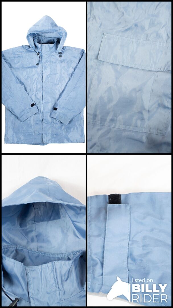Diese praktische Regenjacke von Steeds der perfekte Begleiter im Alltag. Die hellblaue Jacke mit Kapuze hält euch im Stall trocken. Sie hat zwei Taschen mit Klettverschluss an der Vorderseite und hat Größe 176. Sie ist in einem guten Zustand.