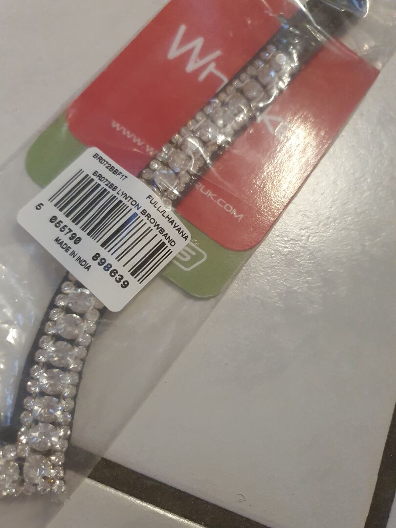 Toller Glitzerstirnriemen von Whitaker in V-Form mit braunem Leder. Leider kam er nie zum Einsatz, da ich seit dem Kauf wieder auf schwarzes Sattelzeug umgestellt habe.