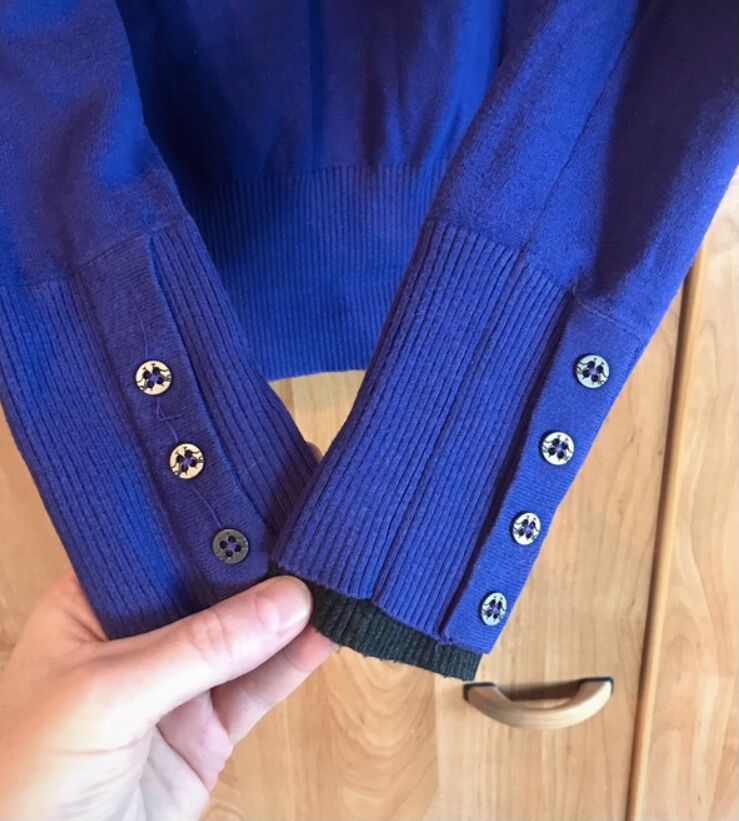 Ich verkaufe hier einen Strickpullover in der Farbe Lila (auf den Bildern wirkt er zum Teil etwas bläulich) und der Größe S. Er ist an Kragen und den Ärmeln dunkelgrau abgesetzt und hat Ellbogenpatches aus braunem, weichen Kunstleder. Der Pulli hat keine Schäden, aber leider fehlt an einem Ärmelabschluss ein Zierknopf (Siehe Bild).