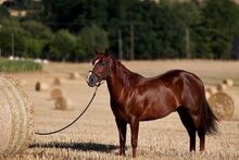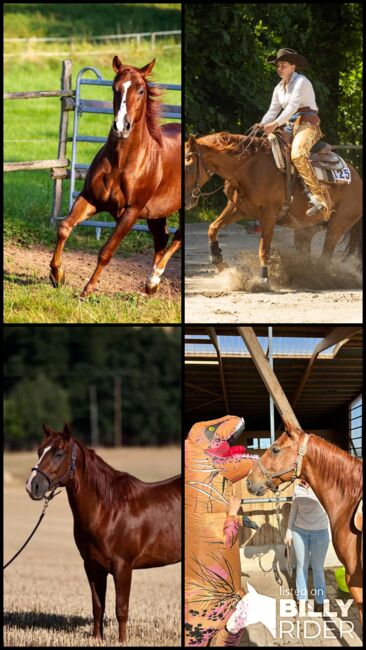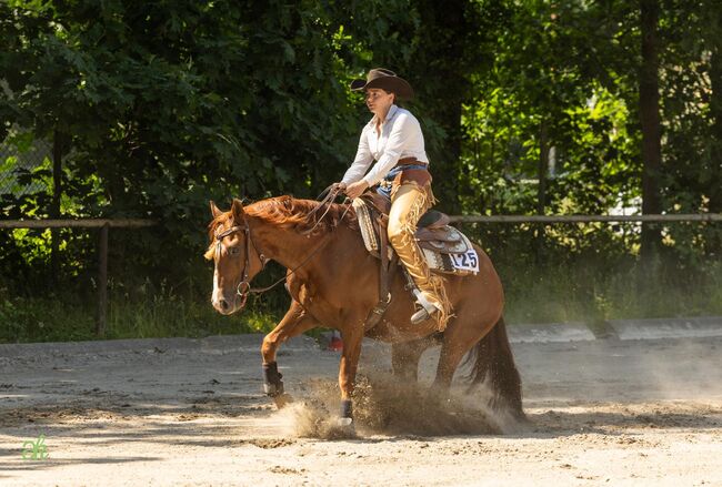 GNR Rooster Cielos, geboren im April 2017, ist ein bildhübscher Quarter Horse Wallach in der Farbe Sorrel mit einem Stockmaß von ca. 150 cm. Er ist korrekt gebaut, kompakt und überzeugt durch seine erstklassige Reining-Abstammung sowie seine solide Ausbildung. Cielo verfügt über einen ausgesprochen freundlichen und menschenbezogenen Charakter. Herdenverträglich, sozial und unkompliziert, zeigt er sich sowohl in gemischten Herden als auch in Box mit Paddock oder auf der Weide äußerst verträglich. Im Umgang ist er sehr lieb, ruhig, umgänglich und hat keine Unarten. Der Wallach ist beschlagen, regelmäßig geimpft und entwurmt. Unter dem Sattel ist GNR Rooster Cielos bequem zu sitzen, lernwillig und talentiert. Reining-Manöver wie Stop, Spin und Rollback beherrscht er sicher, der fliegende Galoppwechsel wird bereits geübt. Im Gelände ist er jederzeit ruhig und zuverlässig, erste Erfahrungen am Rind hat er ebenfalls brav gemeistert. Auf Turnieren wurde Cielo bereits erfolgreich platziert. Gelegentlich zeigt er im Galopp leichte Sensibilität bei zu viel Druck, reagiert dann mit einigen schnelleren Vorwärtsschritten, bleibt jedoch jederzeit kontrollierbar und geht nicht durch. Aufgrund dessen ist der Wallach kein Anfängerpferd, sondern ideal für erfahrene Reiter, die seine Talente gezielt fördern möchten. GNR Rooster Cielos befand sich zwei Jahre im professionellen Beritt und ist bestens ausgebildet. Leider wurde er in den letzten Monaten aufgrund von Zeitmangel wenig geritten und müsste wieder antrainiert werden. Ein leichter Spat hinten links ist vorhanden; Röntgenbilder können auf Wunsch angefordert werden. Er läuft sich nach kurzer Zeit ein. Für einen engagierten Reiter, der sich nicht von dieser Diagnose abschrecken lässt, ist er ein absolutes Highlight mit Potenzial.