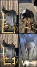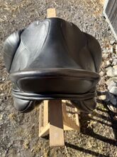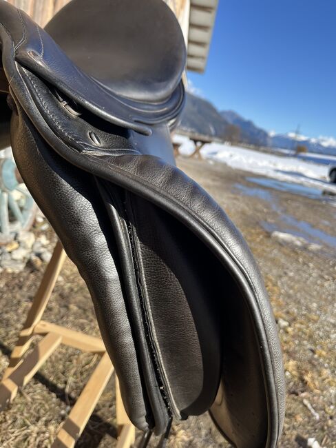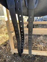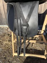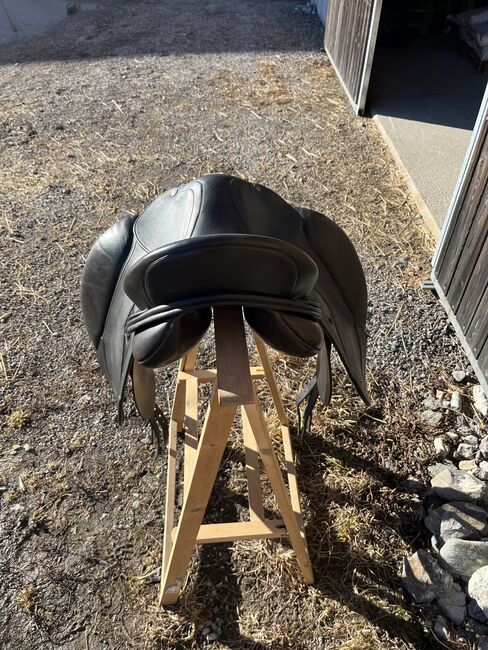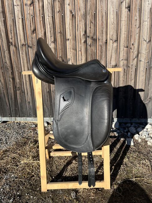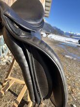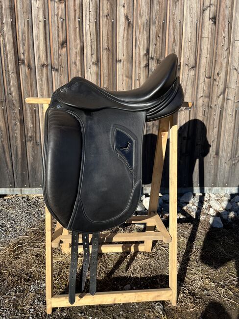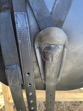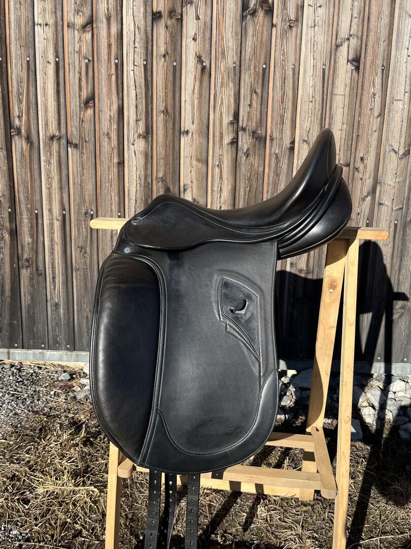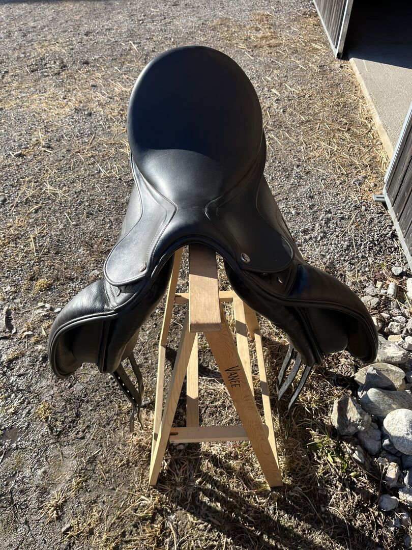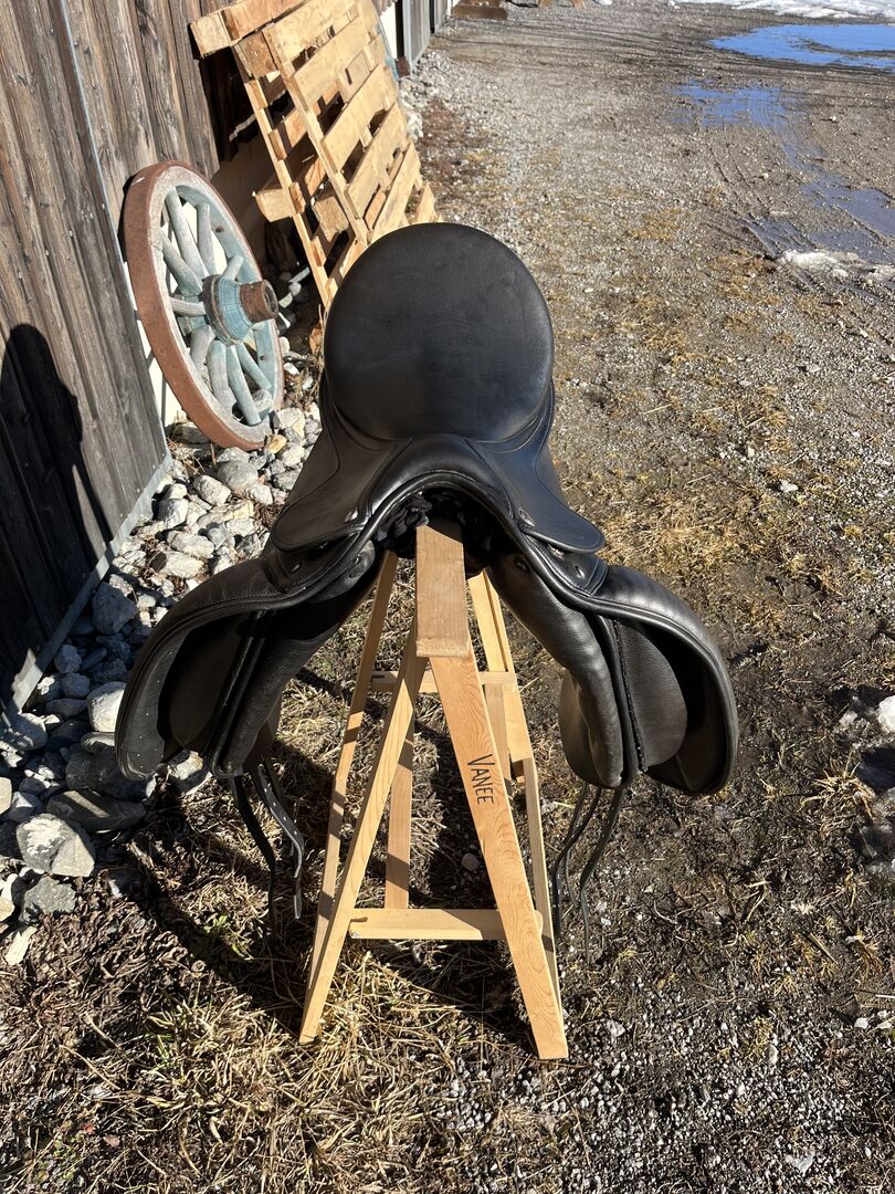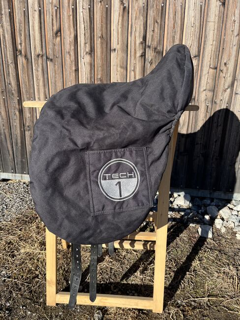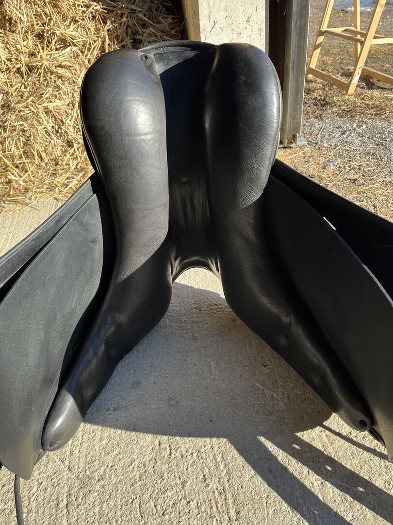 Dressursattel der Marke Tech1 (ist eine Tochterfirma der Nobelmarke Erreplus) in der Größe 17 Zoll und aktueller 34er Kammer. Er wurde Ende 2021 gebaut und ich habe ihn Anfang 2022 neu gekauft. Er hat Klettpauschen, außerdem eine zusätzliche dritte Gurtstrupfe und durch das doublierte Sattelblatt hat man einen sehr angenehmen Halt. Wollegefüllte Kissen und ein thermisch veränderbarer Sattelbaum mit viel Schulterfreiheit ermöglichen eine individuelle Anpassung an unterschiedliche Pferderücken!