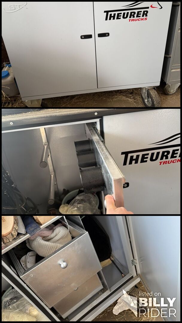Ich verkaufe diesen Turnierschrank. Vorhanden sind zwei verstellbare Sattelhalter, ein rausziehbarer Trensenhalter (für 3 trensen), drei Hacken, zwei Schubladen, einem Fach und die Möglichkeit ein Jackett aufzuhängen. Der Schrank weist kaum Gebrauchsspuren auf. Des Weiteren hat der Schrank eine Öse, damit er automatisch auf große Transporter gezogen werden kann