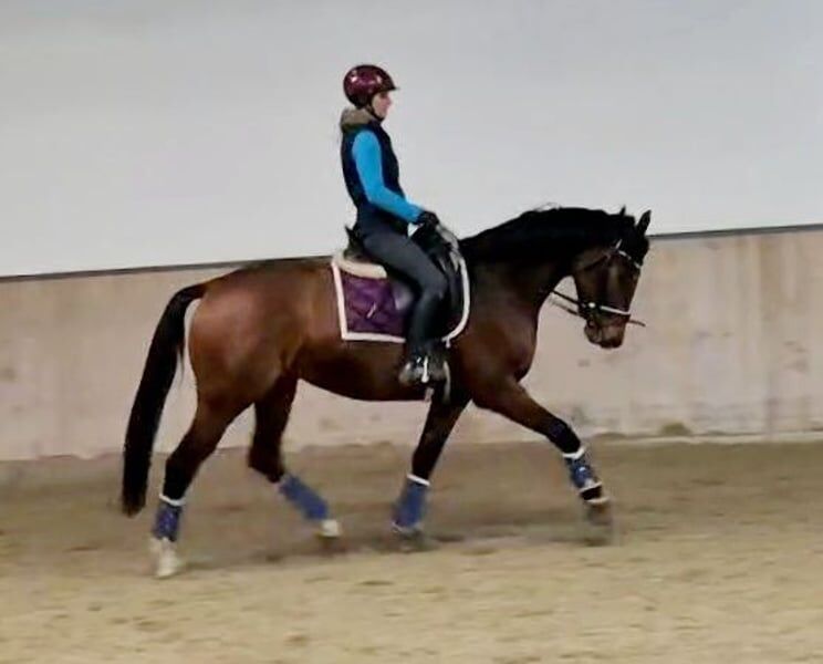 Im Auftrag des Züchters wird hier eine superliebe und sehr hübsche braune Stute mit top Abstammung (Fusionist x Lauries Crusador) angeboten. Sie ist mit derzeit 1,65 m ein ideales Damenpferd. Aufgrund von Bestandsverkleinerung sehr günstig abzugeben. Die Stute ist angeritten. Sie ist brav unter dem Sattel, dennoch aufgrund ihres Ausbildungsstandes kein Anfänger- oder Kinderpferd. Sie hat einen guten Röntgen Tüv. Hauptsächlich ist sie aufgrund ihrer Abstammung für die Dressur geeignet, sie stellt sich aber auch beim Freispringen sehr geschickt an. Für die Zucht wäre sie ebenfalls sehr gut geeignet, da sie eine sehr interessante Abstammung hat ( Vater Fusionist: Franklin- Ehrentanz- Florestan). Aus ihrer Mutter stammt auch eine Stute, die 2022 Preisspitze auf der Vedener Auktion wurde! Schnell sein lohnt sich...eine tolle Stute mit vielen Möglichkeiten zum kleineren Preis!!! VHB 12.800 Euro