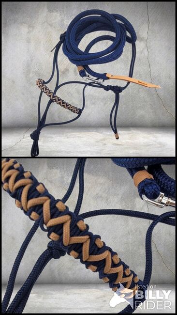 Handgefertigt durch Freespirit Horse Art Knotenhalfter mit Nasenverzierung im Snake-Design. Dazu passend ein 3 m Bodenarbeitsseil Knotenhalfter 6 mm dick, Strick 12 mm dick mit Lederklatsche