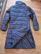 Langer Schnitt, seitlich Reitschlitze zum öffnen mit RV. Vorne, Reissverschluss. Der Mantel ist innen mit Fleece warm gefüttert, hat 2 gr Taschen.