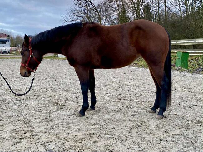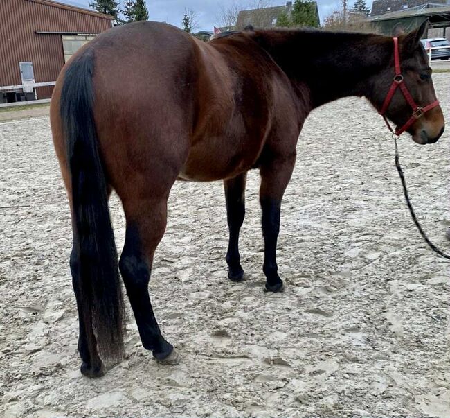Sally Cant Wait - eine bildhübsche Quarter Horse Stute, geboren am 18.04.2023, in der Farbe bay und mit einem aktuellen Stockmaß von 140 cm. Sie ist ein echter Eyecatcher mit toller Farbe, korrektem Körperbau und einem sehr schönen, stabilen Gebäude. Sally ist altersgerecht entwickelt, gesund und es liegen Röntgenbilder ohne Befund vor. Sie wuchs in einer gemischten Jungpferdeherde auf und kennt sowohl Offenstall- als auch Boxenhaltung. Sie wurde stets hochwertig mit gutem Mineral- und Kraftfutter versorgt. Tierarzt und Hufschmied sind ihr bestens vertraut und sie zeigt sich im täglichen Umgang ausgesprochen brav. Sally besitzt einen lieben, sanften und menschenbezogenen Charakter. Sie ist gutmütig, verschmust, zutraulich und wird regelmäßig gehändelt. Das Jungpferde-ABC, Putzen und Hufegeben bereiten ihr keinerlei Probleme. Wird jetzt langsam an die Bodenarbeit herangeführt. Sally ist eine tolle Bewegerin und ein sehr interessantes Nachwuchspferd, das später besonders im Reining-Showbereich großes Potenzial mitbringt. Aufgrund ihrer erstklassigen und sehr spannenden Abstammung eignet sie sich auch hervorragend für die Zucht. Sally ist eine Tochter vom erfolgreichen Tricked Out Spook. ein Spooks Gotta Gun Sohn. Ihre Mutter ist eine Smart Spook Tochter. Sie wird mit AQHA-Papieren und Equidenpass abgegeben und ist zudem NRHA European nominiert. Eine vielversprechende junge Stute mit Charme, hervorragender Abstammung und besten Voraussetzungen für Sport und Zucht.