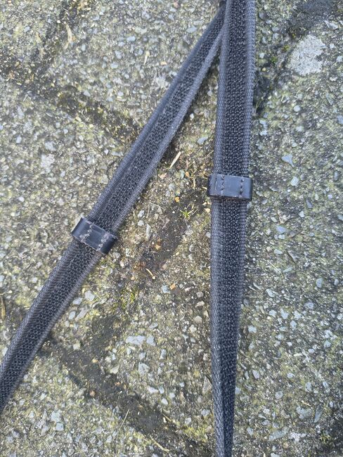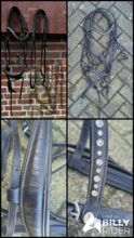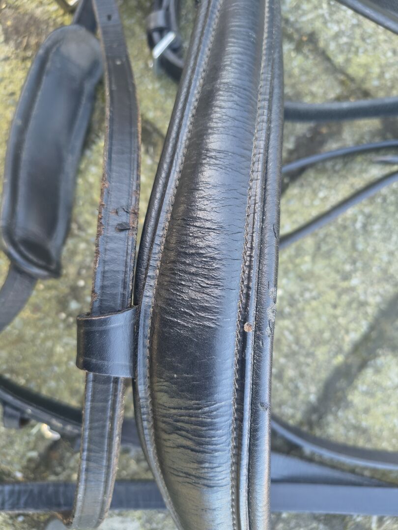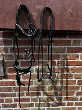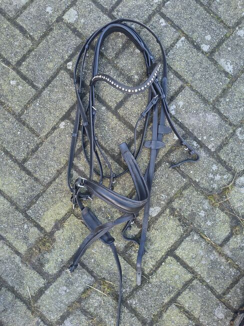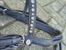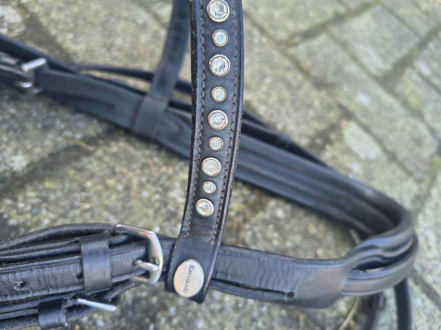 Zum Verkauf steht eine schöne Trense von Kavalkade in der Größe Warmblut mit einem schwedischem Reithalfter und einem Stirnriemen mit größeren Strasssteinen. Zu der Trense gehören Gummizügel. Nasen- und Sperrriemen sind ein bisschen angeschrammt, was aber so und am Pferd nicht sehr auffällt, siehe Bilder.
