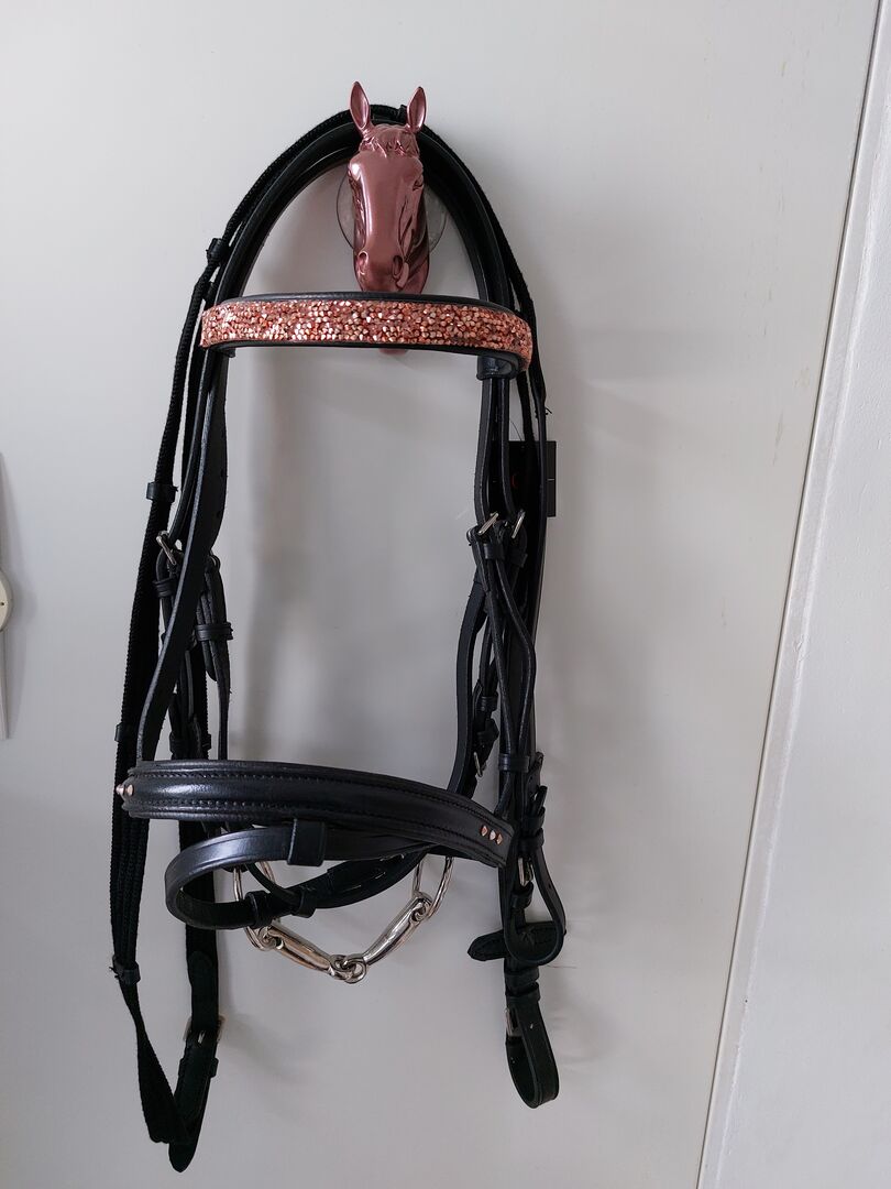 Wunderschöne neue Trense aus schwarzem Leder mit auffälligen Glitzerstirnband in rosegold und rosegold Details aus echten Swarovskisteinen. Wird mit Gurtzügeln abgeben