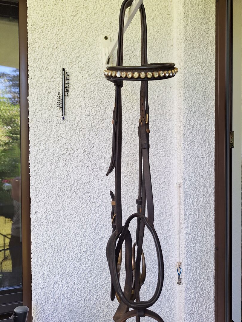 Sehr gut erhaltene Ledertrense mit Glitzerstirnband Beschlag u Gebiss goldfarbenen
