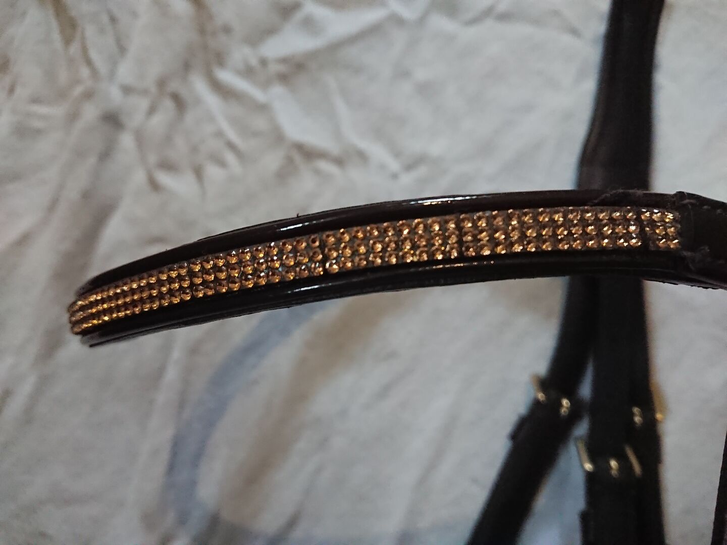 Englischer Trensenzaum, kombiniert, Schlaufe wurde abgetrennt, ist aber dabei und kann proplemlos wieder angenäht werden. Schönes Schokobraun mit goldfarbenen Beschlägen. Kristalle am Stirnriemen, super weiches Leder. Am Genick anatomisch, weich unterlegt, der weich unterlegte Nasenriemen ist sehr breit, was ich an meinem Pferd nicht leiden mag. Der Nasenriemen ist beidseitig verstellbar, seitlich fest mit dem Genick Stück vernäht, daher nicht so einfach austauschbar. Sonst ein schöner Zaum im super Zustand, Zügel noch unbenutzt. Größe Full Warmblut, fällt normal aus.