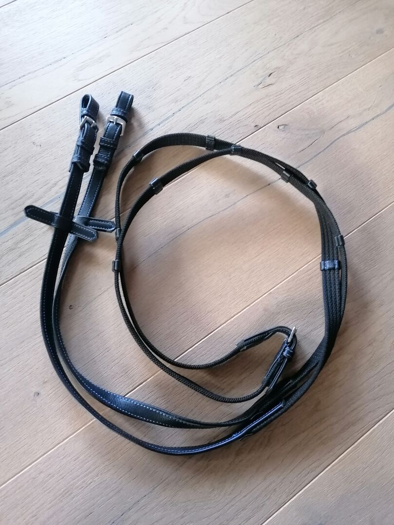 Ich verkaufe hier eine nie gebrauchte Trense mit englischem Reithalfter mit den dazugehörigen Gurtzügeln. Sie war nur einmal zur Anprobe am Pferd. Das Leder ist vegan, die Nähte sind blau, genauso der Strass am Stirnriemen.