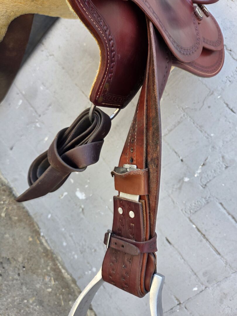 Nachdem Stuti durch Alter und Arthrose nicht mehr reitbar ist, verkaufe ich einen Triple W Platinum in chestnut mit braun abgesetzter Sitzfläche aus Glattleder. Bei dem BT-Allround handelt es sich um einen 1031-FQH-Baum mit Schaffellunterseite.