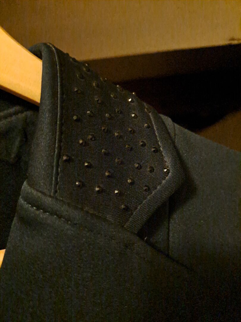 S - dunkelblau; mit Strasssteinen am Kragen und Rücken; Knöpfe und Reißverschluss in Rosegold