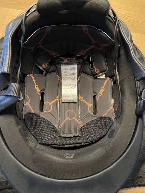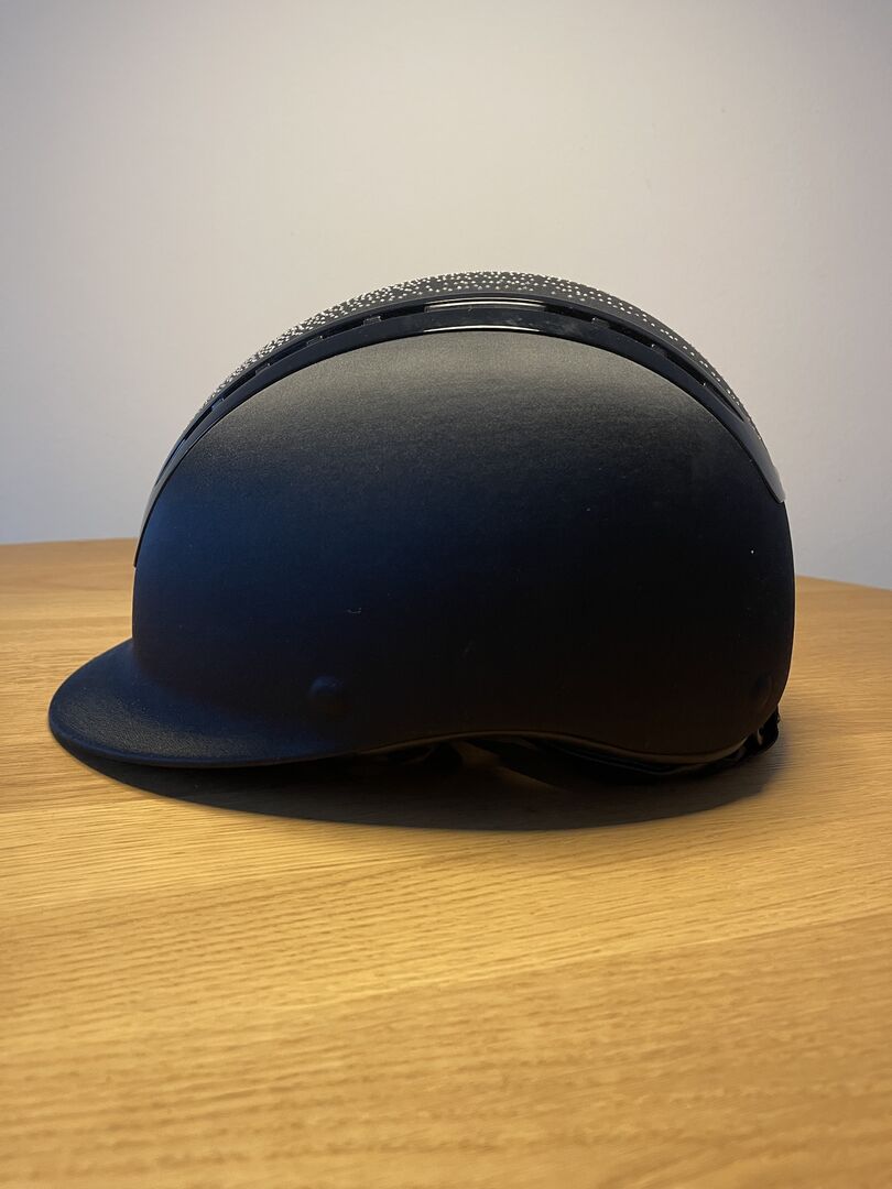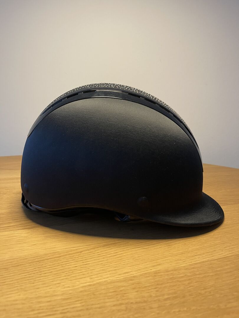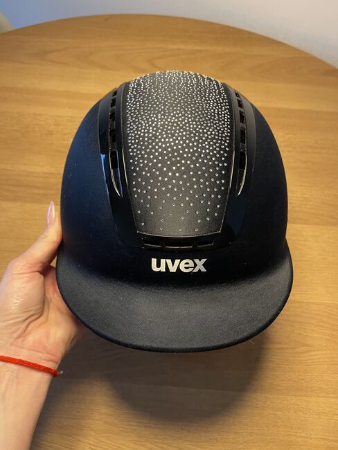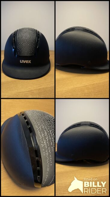 Getragener Uvex Reithelm suxxeed juwel in Schwarz. Helm hatte keinen Sturz. Alle Steine vorhanden, wurde immer pfleglich behandelt. Hat einen leichten Kratzer oben links, der kaum auffällt (siehe Bild 3). Das Inlay müsste erneuert werden, mir ist beim waschen leider das Stirnpolster kaputtgegangen. Lässt sich online für 25€ finden. Mit Staubbeutel. NP lag bei 649€.