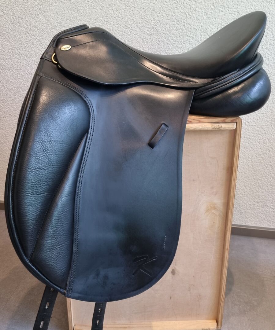 Dressursattel mit mitteltiefen Sattelbaum und mittlerer Neigung des Sattelblattes. Dank verbreiteter vorderer Kammer ist dieser Sattel gut geeignet auf runden Pferden. Mittelgroße weiche Kniepauschen bieten eine angenehme Unterstützung der Reiterbeine. Der Sattel ist geeignet für Reiter, welche im Sattel relativ viel Zeit verbringen. Sitz und Kniebereich sind standardmäßig hergestellt aus rutschfestem Kalbsleder.