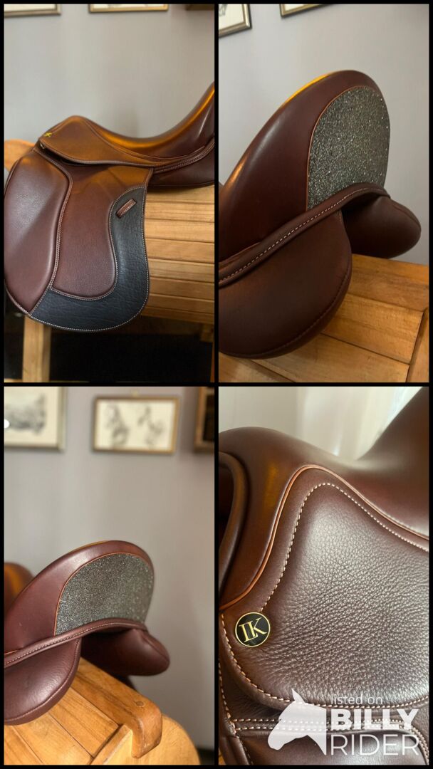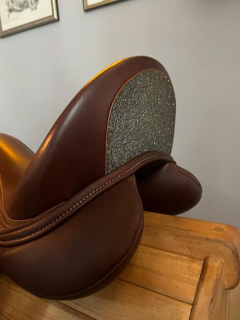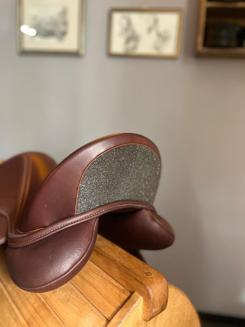 Er ist ein "Tiefsitzer", hat große Vollpauschen vorn unter dem Sattelblatt (was diesen Sattel auch für Pferde mit viel Schwung oder etwas mehr Temperament "sicher" macht), es handelt sich um einen Monoblatt-Sattel. Braunes Leder mit Glitzer. Er sitzt sich auch nach 3 Stunden im Gelände immer noch super bequem, bei einem Sprung oder auch in der Dressurarbeit. Der Sattel ist ein toller Allrounder!
