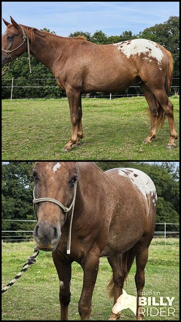 Zum Verkauf steht der bildhübsche Appaloosa-Wallach Waps Rolex, direkt vom Züchter, mit hervorragendem Charakter und viel Potenzial für Sport und Freizeit. Appaloosa Wallach, geb. 03.09.2021, ca. 160 cm, Farbe: liver chestnut with blanket. Er überzeugt durch ein korrektes, harmonisches Gebäude, ein solides Fundament mit starken Knochen und guten Hufen, läuft barhuf und ist ausgewogen bemuskelt. Seine weichen und angenehmen Grundgangarten machen das Reiten besonders komfortabel. Waps Rolex ist sehr menschenbezogen, ruhig und brav im Umgang, dabei verspielt und stets interessiert an dem, was sein Besitzer macht. Er möchte immer gefallen, lernt schnell und bringt ein ausgeglichenes, angenehmes Temperament mit. Er wuchs im Herdenverband auf, ist dort mittelrangig und sozial gut integriert. Verladen ist für ihn kein Problem, Tierarzt und Hufschmied kennt er selbstverständlich. Der Wallach besitzt eine gute Westernausbildung und wird aktuell vom Profi weiter in Richtung Ranch Riding gefördert. Die meiste Zeit seiner Ausbildung verbrachte er im Gelände und kennt das Reiten an unterschiedlichen Orten wie z.B. Strand. Unter dem Sattel zeigt er sich sehr zuverlässig, mit Talent insbesondere für Ranch-Klassen, ist aber ebenso als vielseitiger Freizeitpartner geeignet. Gesund, regelmäßig geimpft und entwurmt, dem Zahnarzt regelmäßig vorgestellt und 5-Panel n/n. Die ApHC-Papiere liegen vor. Ob als zukünftiges Showpferd oder als zuverlässiger Freizeitpartner - mit seinem goldenen Charakter und seiner guten Abstammung ist dieser Youngster ein echtes Versprechen für die Zukunft.