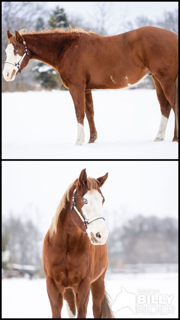EFR Mr Chillichocolate ist ein bildhübscher Paint Horse Wallach, geboren im März 2021. Er hat die Farbe Sorrel Overo und zwei blaue Augen. Sein Stockmaß beträgt aktuell etwa 157 cm. Der großrahmige Wallach überzeugt mit einem ausdrucksstarken Kopf, einem korrekten Gebäude und einem guten Fundament. Durch seine Größe deckt er auch größere Reiter gut ab. Er ist gesund, regelmäßig entwurmt und geimpft, schmiedefromm und derzeit unbeschlagen. Nachts steht er in der Box(Offenstall) und tagsüber auf dem Paddock, im Sommer genießt er 24/7 Weidegang. Herdenhaltung kennt er bereits seit dem Fohlenalter und ist daher sehr gut sozialisiert. Er durfte unter besten Bedingungen in Ruhe aufwachsen. Charakterlich zeigt der Wallach sich sehr lieb, menschenbezogen und verschmust. Er ist neugierig, ausgeglichen, cool und nicht schreckhaft. Im Umgang ist er entspannt, unkompliziert und brav, sowohl vom Boden als auch unter dem Sattel. Er ist sehr gelehrig, lernt gerne Neues und bringt viel Talent mit. Der Wallach verfügt über sehr gute, ausdrucksstarke Grundgangarten und besitzt eine erstklassige Allround-Abstammung (Whataholic x Zippos Mr Good Bar). Dadurch ist er sowohl für den Sport als auch für die Freizeit interessant. Er ist angeritten, befand sich kurzzeitig in Profiausbildung und kennt sowohl Bodenarbeit als auch die Arbeit an der Doppellonge. Außerdem geht er bereits an der Hand ins Gelände. Der Wallach ist ins EWU Jungpferdeprogramm einbezahlt und sein Vater kann vor Ort besichtigt werden. Aufgrund persönlicher Umstände wird dieser tolle Wallach mit ansprechender Optik, gutem Gebäude und einem besonders lieben Charakter schweren Herzens nur in die besten Hände abgegeben. Zum Angebot des Anbieterslaunch