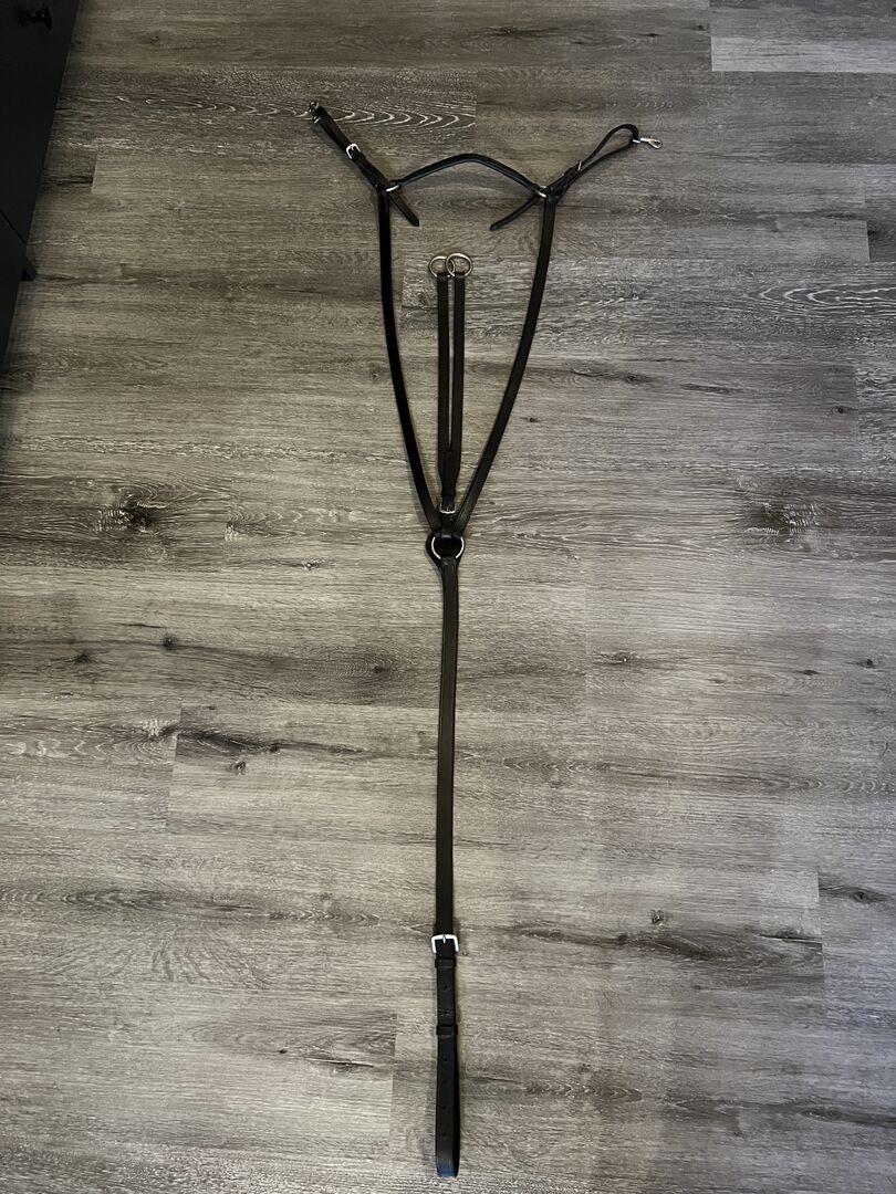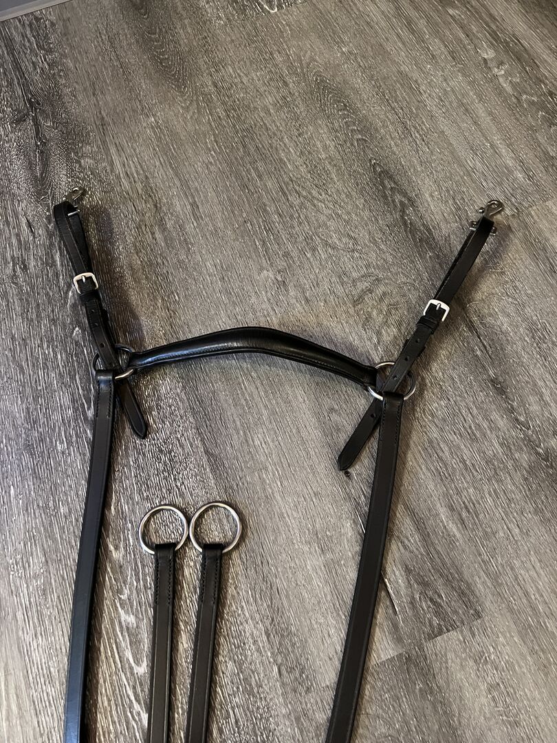 Verkaufe ein gebrauchtes aber in sehr gutem Zustand befindliches Vorderzeug mit abnehmbarer Martingal Gabel. Das Leder ist weich, nicht hart oder porös. Es sind zwei Haken am Vorderzeug, damit man dies am Sattel befestigen kann. Für den Sattelgurt ist kein Haken dabei, ich schau aber nochmal ob ich noch einen da habe, dann wird dieser mitgeliefert. Ich habe das Vorderzeug sehr selten verwendet, daher ist es in einem top Zustand. Mittlerweile benötige ich es nicht mehr, daher darf es ausziehen.