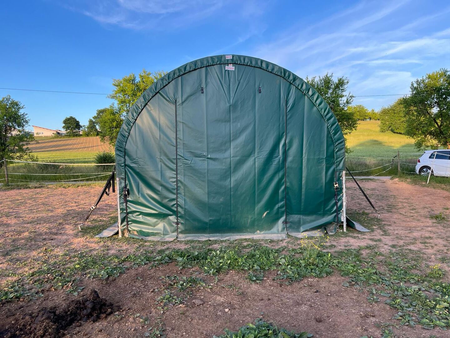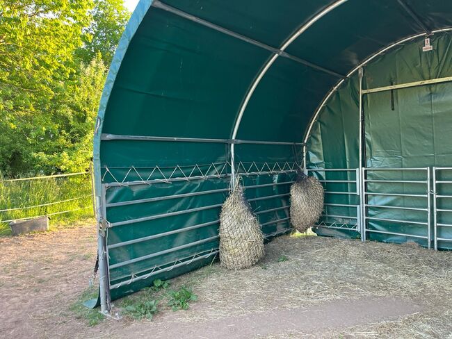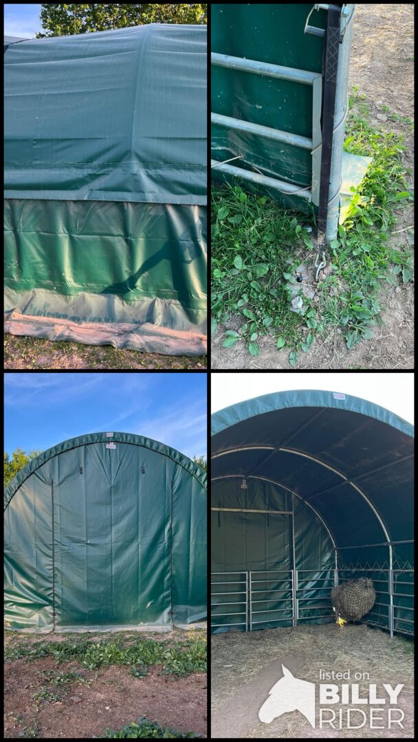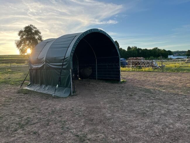 Biete neuwertiges Weidezelt von Toolporth, 4x4m Weidezelt, PVC-Plane, dunkelgrün, Erdbefestigung Professional Stabiler und wetterfester Unterstand als Ruhe- und Futterplatz Belastbare Rundbogenbauweise Einfacher Aufbau dank praktischem Steck-Schraubsystems Sehr reißfeste und wasserdichte PVC-Plane 2300 N (NP 1699€)