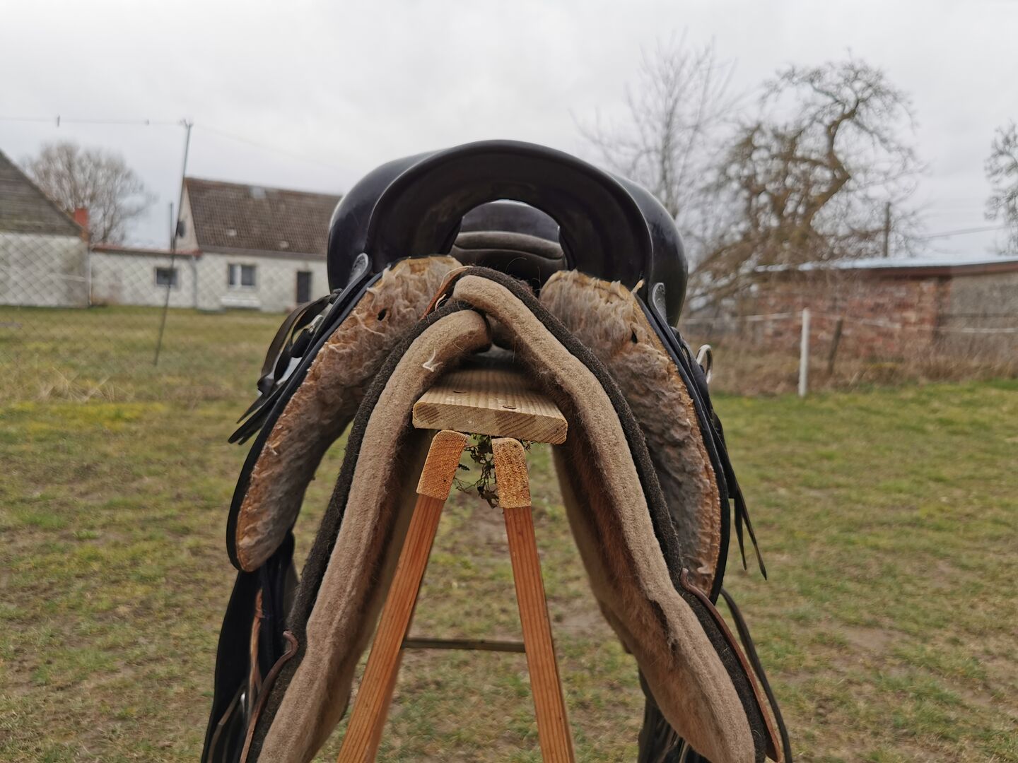 Gebrauchter Freizeit/Westernsattel ohne Horn von Podium. Gut geeignet für Lange Ritte ins Gelände sowie auch für Platzarbeit oder kurze Strecken. Da man in diesen Sattel bequem drin Sitz durch Wildleder. Hat normale Gebrauchsspuren. Lag auf einen sehr schmales Pferd mit viel Widerriss..