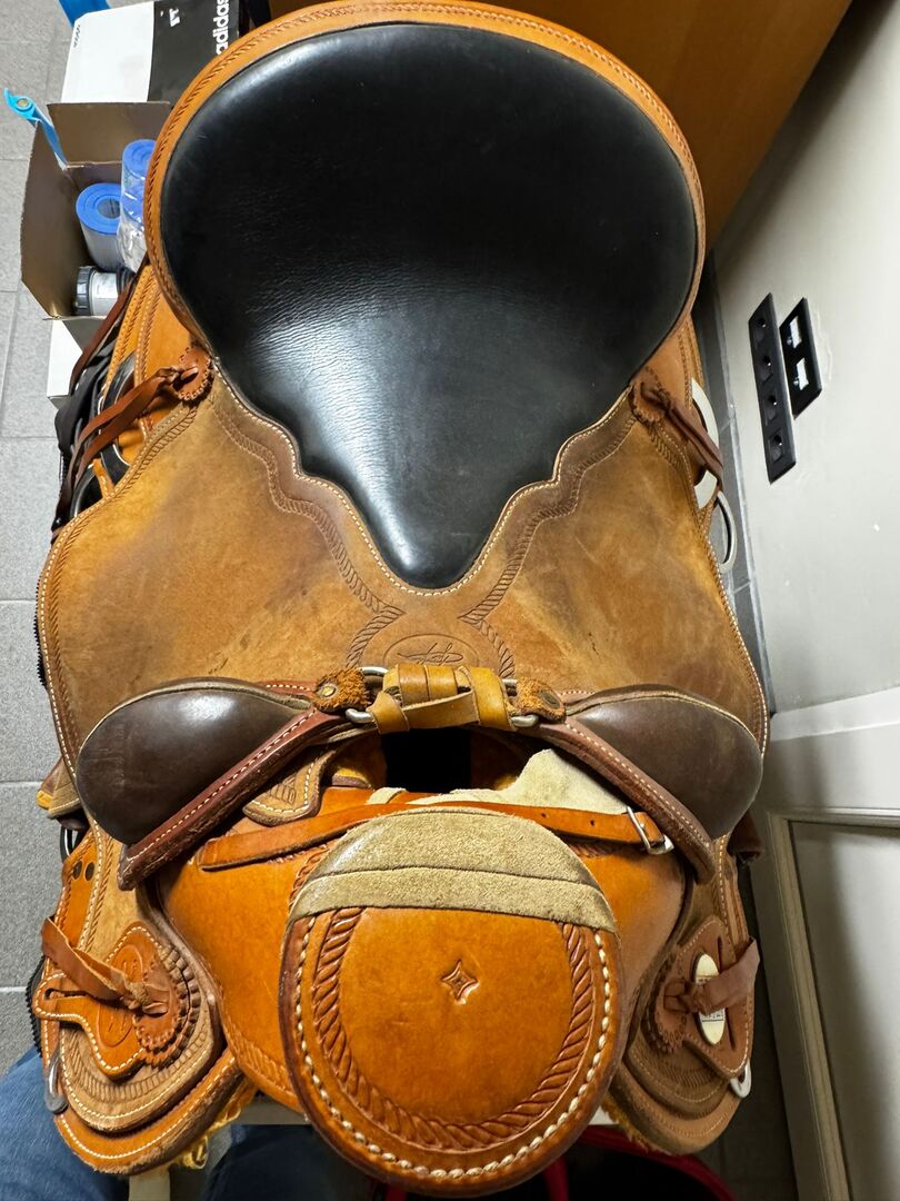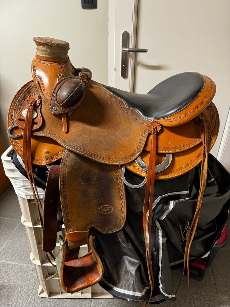 Westernsattel für die Arbeit auf der Ranch - 17 inch RANCH working saddle, FQH saddler, made by saddler GIANNA GHIAZZA for the French Quarter Horse Association, high quality leather, very comfortable, sold with cover, like new condition. spricht französisch, englisch oder spanisch. für weitere Informationen rufen Sie uns an, +32 475632908.