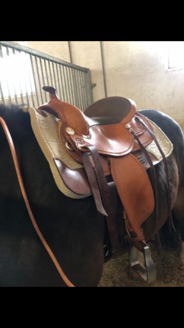 Wir verkaufen unseren Westernsattel von Bearflex; Er war ungefähr ein Jahr in Benutzung und hat nur leichte Gebrauchsspuren. Verkauft wird er inklusive einem Filzpad(40cm x 80cm), einem 100cm Sattelgurt von Stone Deek, einem farblich passendem Vorderzeug (Full), sowie einem paar ungebrauchten offenen Lederzügeln(je 2,5m).