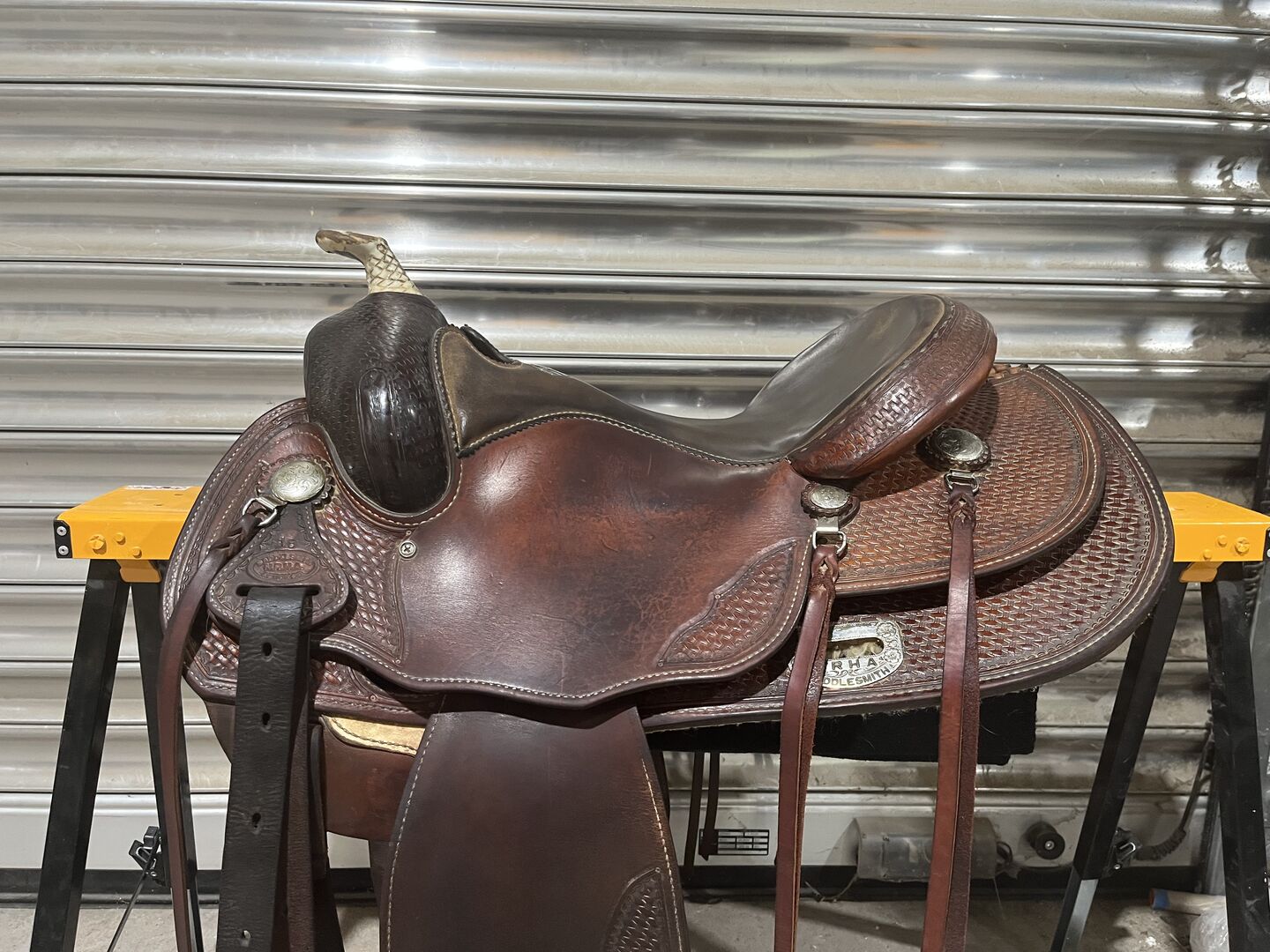Verkaufe meinen tollen Westernsattel da er meinem Pferd leider nicht mehr passt. NRHA Bob Loomis Reiner von Saddlesmith, Sitzgröße 16“, FQ Baum aus Holz, 3 Punkt-Gurtung, Steigbügel aus Alu, Tie-Straps auf beiden Seiten, round skirt.