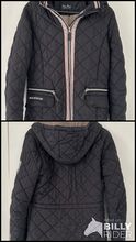 Die Jacke ist gesteppt, mit Futter und Wattierung Abnehmbare Kapuze Marke: Felix Bühler Farbe: schwarz, innen taupe Größe: S Vorne Reißverschluss Zwei Reissverschluß- und zwei Einstecktaschen mit Knöpfen vorne Material:100% Polyester Maschinenwaschbar