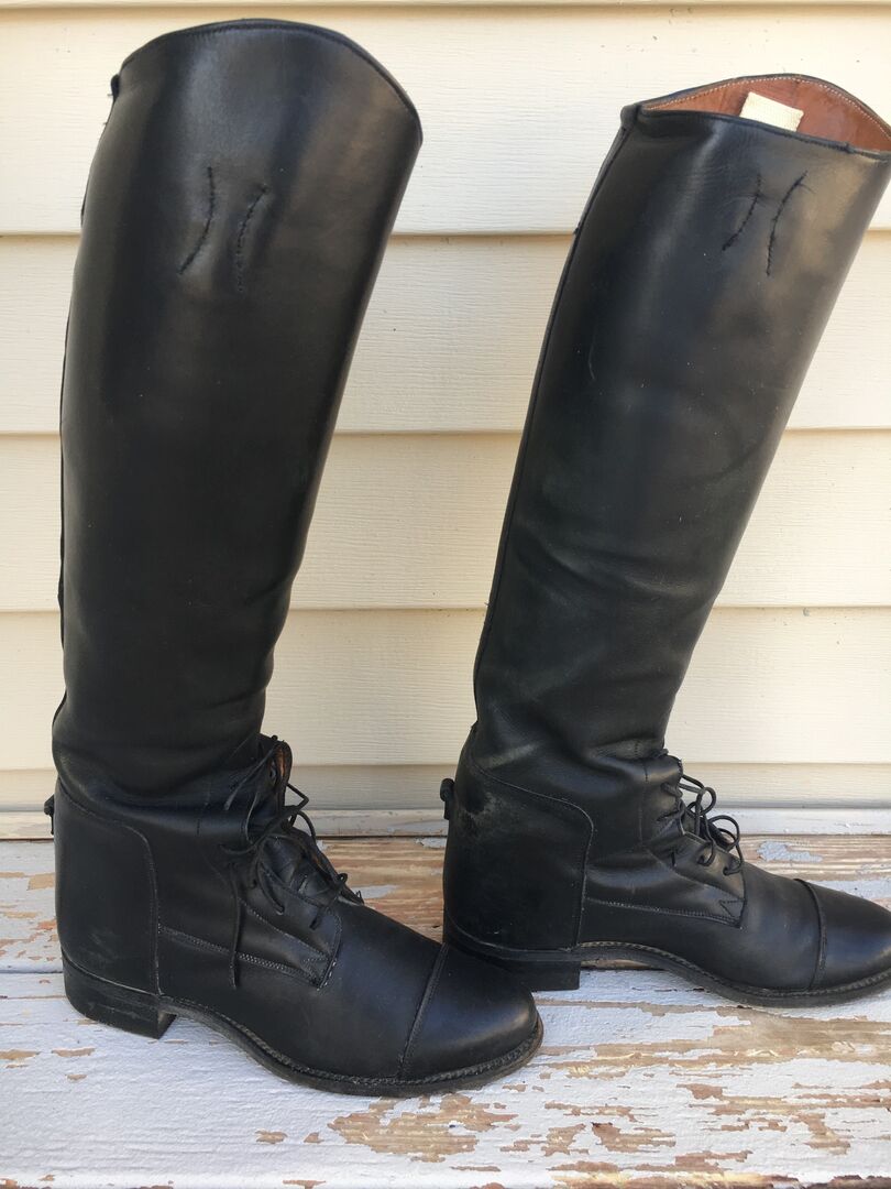 GORGEOUS Women's Dehner Black English Reitstiefel Größe 6 (9-1/4 Zoll Einlegesohle bis zur Ferse); misst 16 Zoll Rückseite des Knies bis zur Ferse des Fußes und 17 3/4 Zoll Rückseite des Knies bis zum Boden; Kalb Maßnahmen 13 1/2 Zoll an der breitesten Stelle. Wird Boot-Pulls, Kalb UND Fuß Bäume zu erhalten Form. Gebraucht, aber in schön gebrochen. MUSS SEHEN! Kann lokale Pick-up / Drop off oder Schiff mit USPS Priority Mail zu diskutieren.