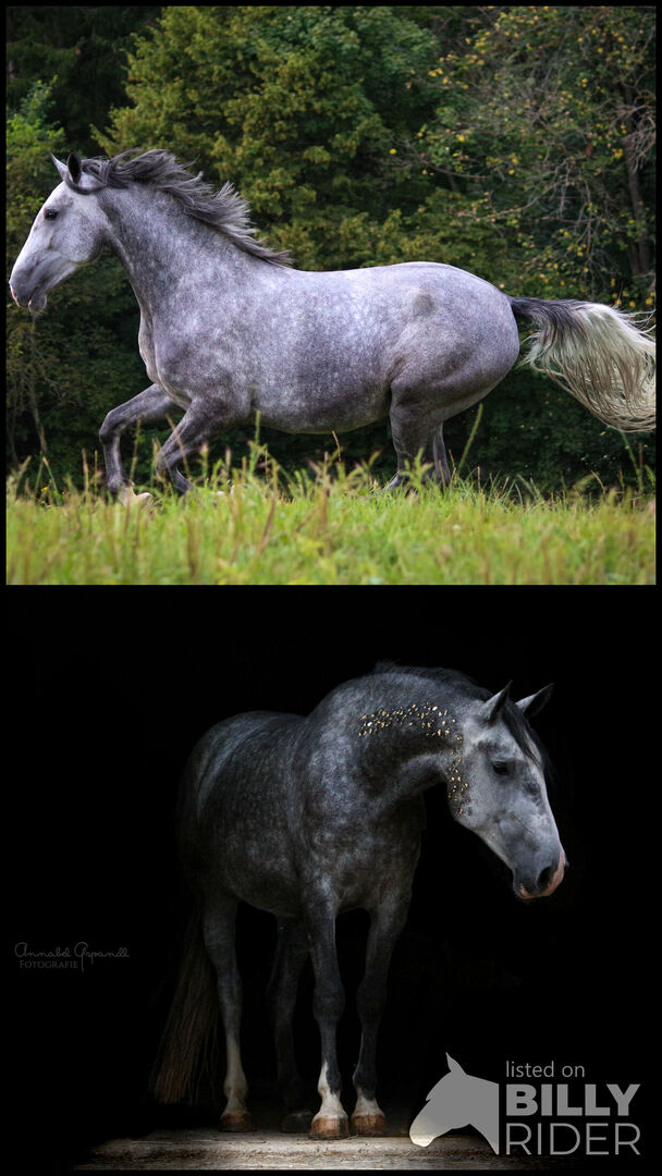 Ich bin Nioma einen hübsche 4-jährige Lipizzaner Stute abstammend von der MAESTOSO-Linie. Ich werde schon in allen Gangarten im Viereck geritten und übe mich sogar schon in den Anfängen der Seitengängen. Meine Besitzerin meint, dass ich sehr talentiert bin. Am allerliebsten gehe ich aber Ausreiten, dabei ist es mir egal ob ich alleine oder mit anderen unterwegs bin. Egal was du mit mir machen möchtest, ich bin immer motiviert und sehr bemüht.