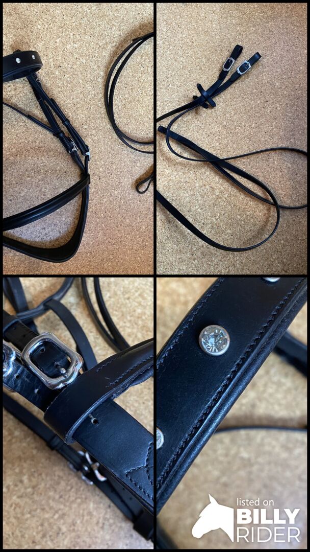 Schöne, hochwertige schwarze Ledertrense von Loesdau. Mit Glitzersteinen am Nasenriemen. Zügel aus Leder. Der Neupreis war 69 € Ich habe die Trense meiner Tochter für ihr Jungpferd geschenkt, aber sie will jetzt gebisslos einreiten. Daher benötigen wir jetzt eine andere Trense, denn die lässt sich nicht so "umbauen" wie wir das brauchen. Die Trense ist nagelneu, sie war nur einmal am Pferd zum die Größe checken.