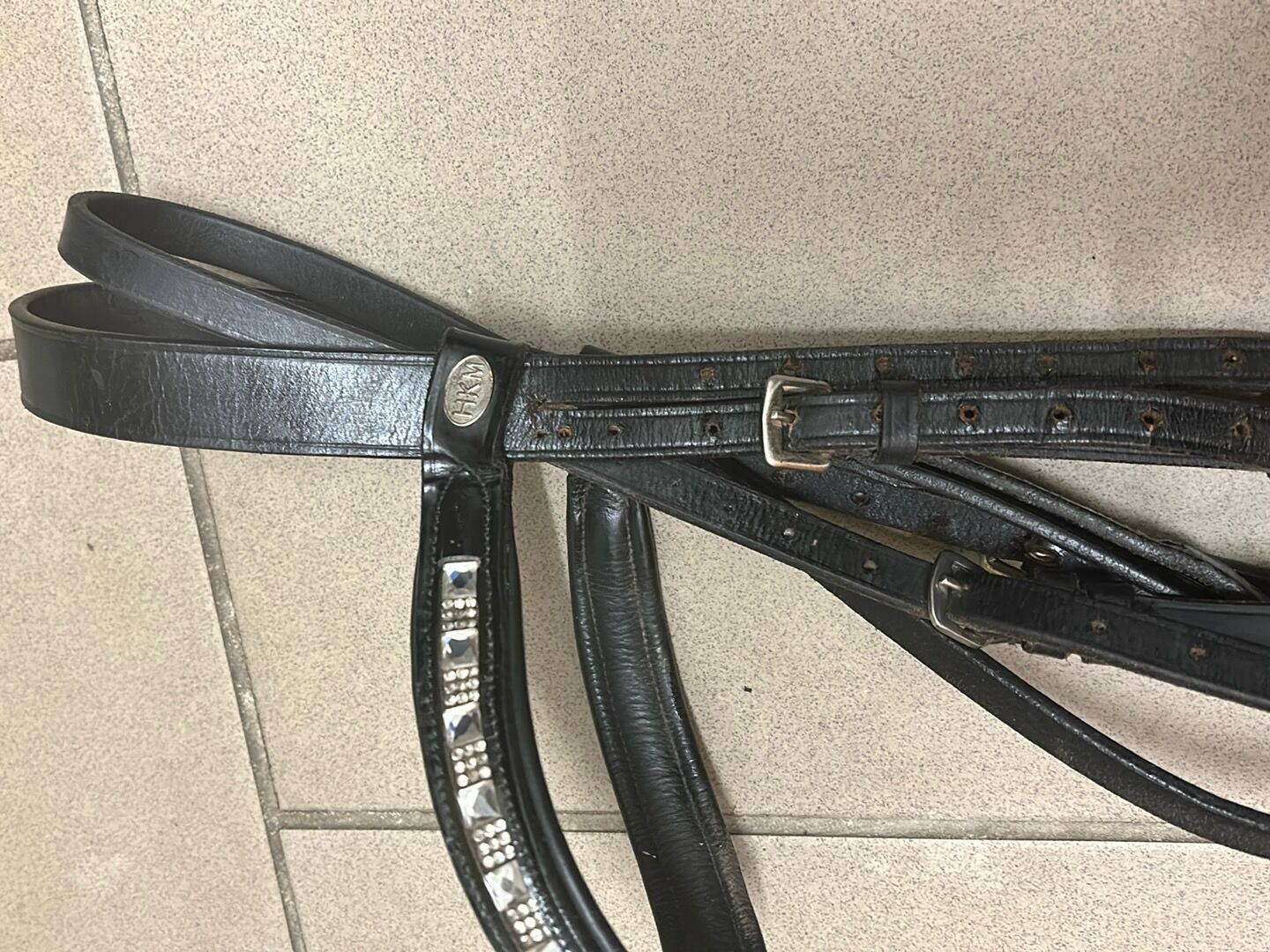 Zaumzeug mit Gebiss 12,5cm Größe COB Lack Nasenriemen Stirnriemen von HKM (alle Steine vorhanden) Beim Nasenriemen ist ein Stück Riemen abgebrochen siehe Fotos, dennoch genügend Löcher zum verstellen vorhandenen