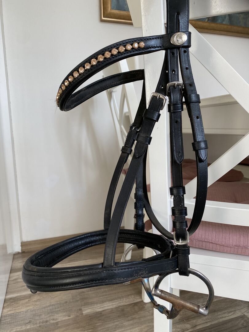 Englisch-kombiniertes Reithalfter. Stirnriemen ist mit rose farbenem Strass besetzt. Es hat Gebrauchsspuren ist aber gut erhalten-keine Defekte und alle Steine sind komplett. Es sind weder Sperrriemen noch Zügel dabei. Dafür ein sweetiron Gebiß(doppelt gebrochen, D-Ring,12,5cm) Versand trägt Käufer